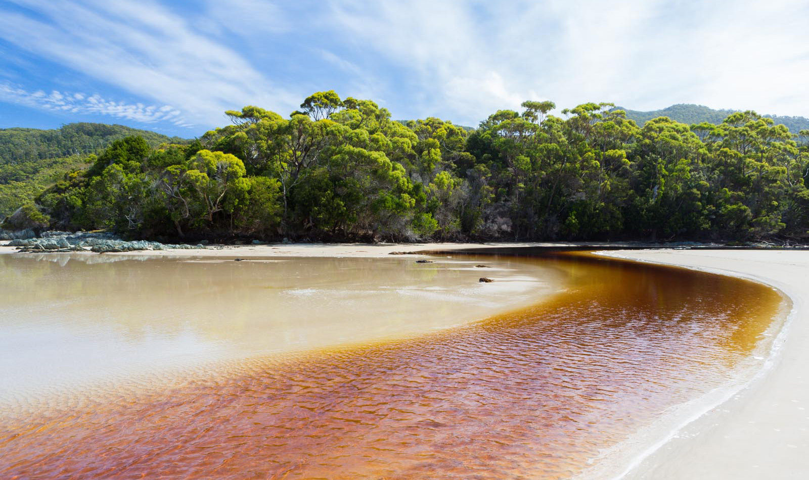 I walk along pristine beaches, mesmerised by the rolling, roaring surf. My boots crunch as they sink into the damp sand, leaving behind a trail of meandering footsteps. I wade across tannin-stained creeks, listening to the calls of parrots, and spot hopping wallabies and burrowing wombats as I squelch through wet moorlands.