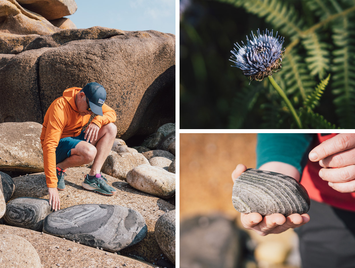 We begin by jumping across the rocks on the southern end of the island. Christine picks up a rock. It’s mostly grey, but marked by concentric veins. It’s the type of rock that geologists take their photo next to, and their explanation of it will probably blow the mind of anyone listening. The patterns, echoed across this end of Île Milliau – which consists of darker rock embedded in granite boulders – is evidence of rock that was formed between hot magma and cold metasediment. What makes Île Milliau so distinctive is how the island showcases both the smooth, weather-rounded granite boulders and the raw fractures of its uplifted bedrock.