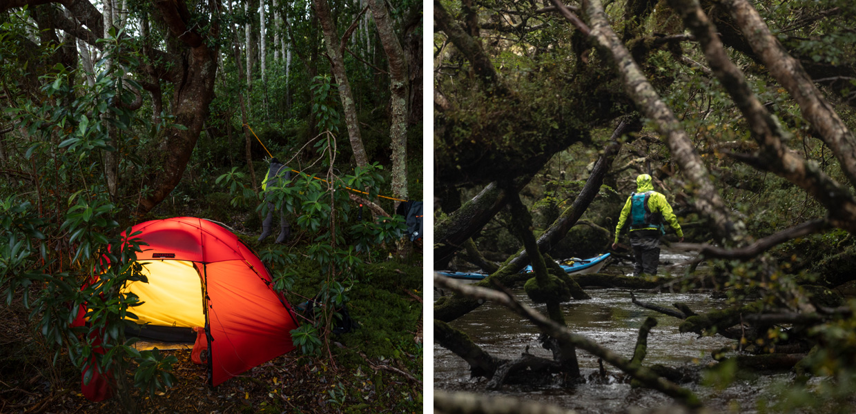 Leaving the river less than 1km from the foot of the climb, we dragged a route between what scant open ground we could find. Much of the terrain was thick scrub or forest. Our progress slowed to an arduous 100m per hour or less as we fought and clawed our way through vegetation, around and over trees, scraping and scrabbling and hauling. After that first eight-hour day we set camp at the foot of the climb, having managed just over 2km. Our hands were in agony – wrinkled like prunes, bloodied knuckles, full of thorns – and our knees and joints ached from carrying and dragging the weight of the kayaks. Seumas said what we were both thinking: ‘We’re not even halfway.’