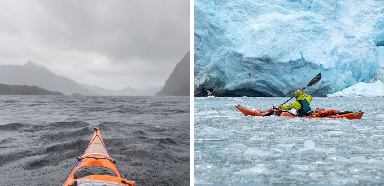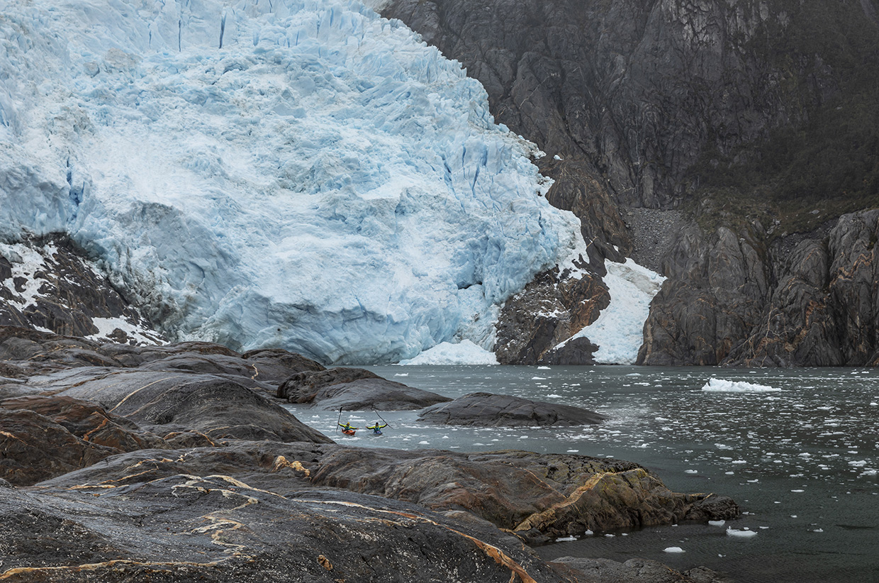 Our first detour took us into Seno Heli, a narrow fjord leading to a spectacular glacier at its head. This was our first time paddling with icebergs on this journey and brought back memories from our first trip, during which ice was the primary adventure goal. The glaciers boomed as they calved more icebergs, adding to the stately, sculptural shapes floating in the fjord.