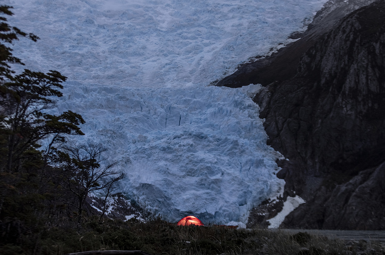 Pia Fjord came next – arguably one of the most spectacular places I’ve visited in Chile with a huge escarpment that rose over the fjord a little like Half Dome in Yosemite, and a colossal broken ice face leading into it. We camped directly in front of the glacier, high up at a safe vantage point.