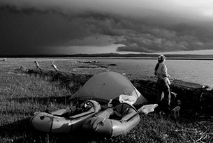 But eventually the bushes of the delta gave way to grass flats and, anxious to stretch our legs, we hopscotched along the inviting strips of land—walking when we could, then jumping into our rafts to cross the dozens of remaining ponds and sloughs. We practiced this in-and-out routine for hours, passing a large flock of molting, flightless White-fronted Geese whose movements resembled our own. Paddle, waddle, paddle, waddle, and repeat.