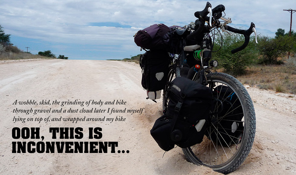 The next couple of days were full of pain and misery and felt more like fighting for survival than a fun adventure. The gravel road was very rough with many deep sandbanks. My left arm could only be used at about 80% and my ribs hurt like hell at bumps, so I found myself puffing and panting like an F16 pilot in a G simulator tensing my chest muscles for every bump and grabbing breaths in between. If I hit a sandbank I was unable to power through so instead often just dropped the bike to save the pain in my ribs or arm. Though picking a 60kg+ bike up out the sand several times a day is a poor second choice and sometimes I almost passed out from the pain.