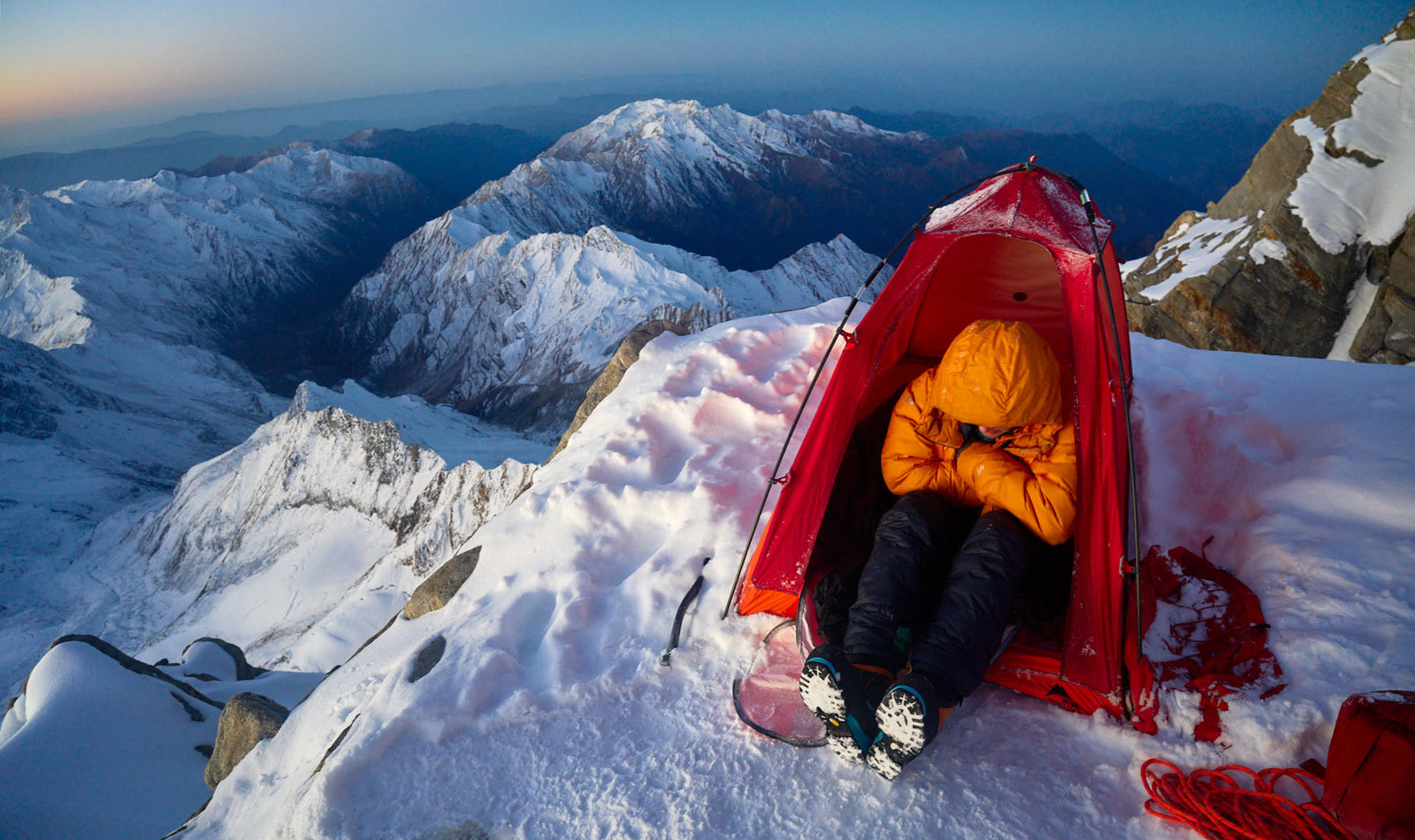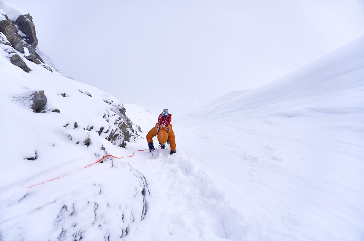 After a day of approach, the first day’s climbing was one of the most demanding I’d ever had in the mountains. Icy runnels and steep, loaded snow slopes. Over 1,000m of vertical in bad weather and on tired legs. As the daylight faded, we at last reached the ridge. Then, on day two, a narrow mixed ridge – sparse protection, run out, no room for error. High consequence. And that was before the snow and cloud returned. With increasing concerns around poor visibility and a high chance of making a mistake and falling down the south face, we decided to bivvy on a small ledge. We’d push for the summit in the morning.