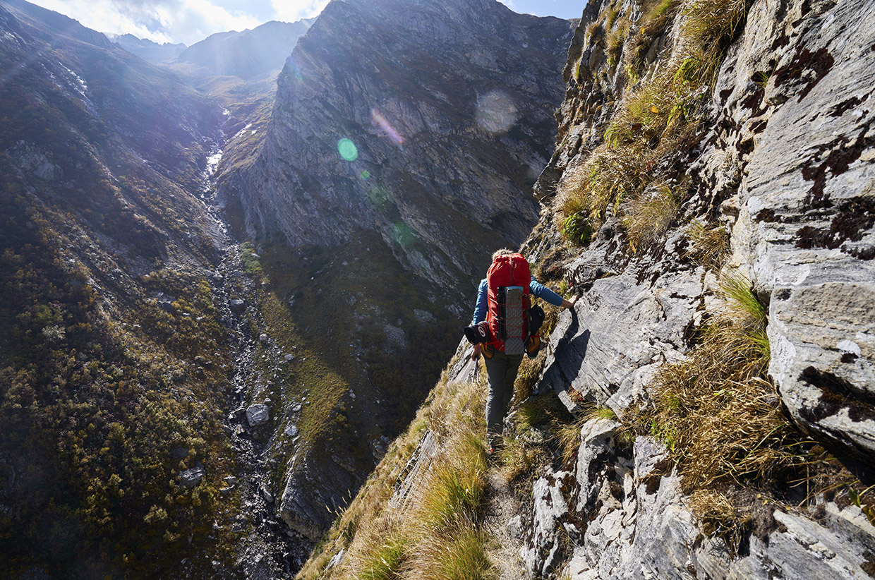 With scant information about other teams find-ing a way through, the gorge had been the question mark for the whole trip. Everything hinged on this. While Paul tried to find a route on the south side of the river, I followed Matt up a vague trail leading to cliffs. The trail turned into exposed, narrow ledges, and we eagerly continued into an arid, desert-like landscape. White peaks glittered overhead.
