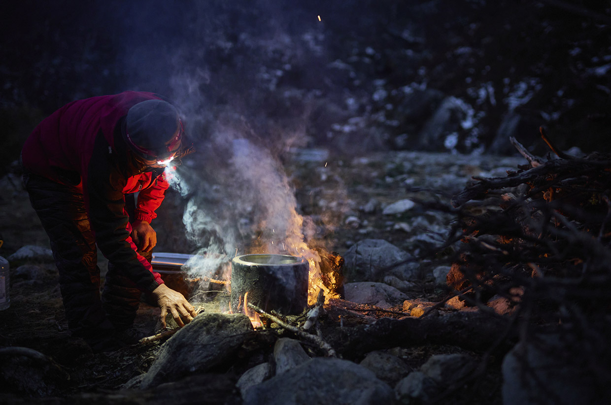 We spent the next few hours trying to dig out the tent and our belongings, but a continuous flow of spindrift undid our efforts. Eventually giving up, we dug out a tiny ledge to perch on and huddled together for warmth, our feet dangling into the blackness of the gully below. It was in these moments that I fully appreciated how glad I was to be doing this with Matt – sitting there in the freezing cold, in the darkness, on a tiny ledge, with no shelter, and spindrift pouring down around us. ‘It’s insane, isn’t it?’ he said after a while. ‘The suffering we put ourselves through voluntarily.’ I laughed. The situation was so shit there was nothing we could do but laugh. It made light of what would otherwise have been a miserable few hours until dawn.