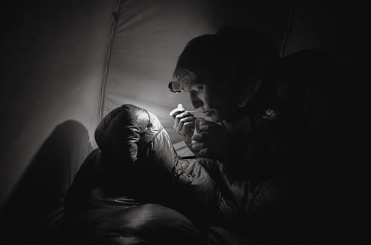 I woke from deep sleep to a noise like thunder and a sense of pressure in my ears. Disoriented, it took me a moment to realise what was happening: a powerful torrent of spindrift was slamming into the tent. ‘What the fuck?’ Matt cried as we both lunged upright in our sleeping bags, using our bodies to add structure to the shelter and stop it from being squashed. One side was bulging inwards – dramatically, terrifyingly.