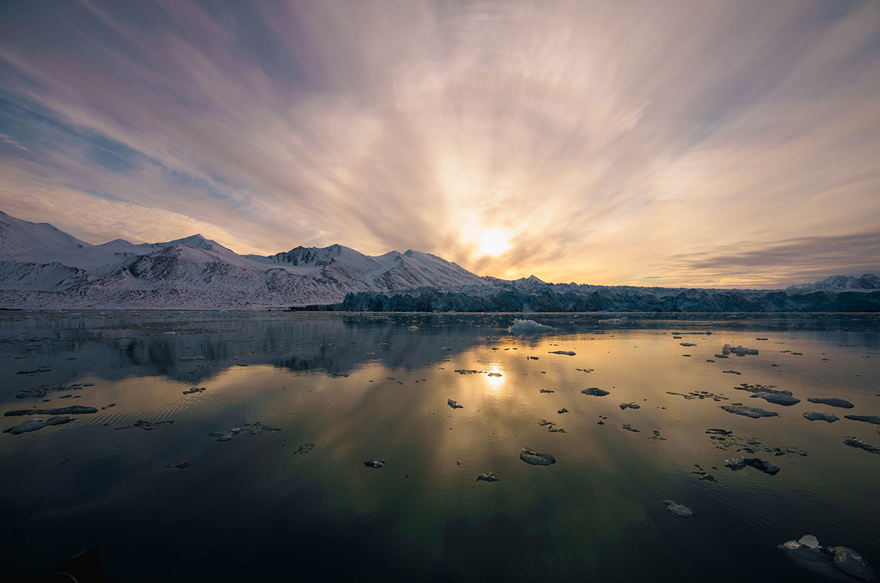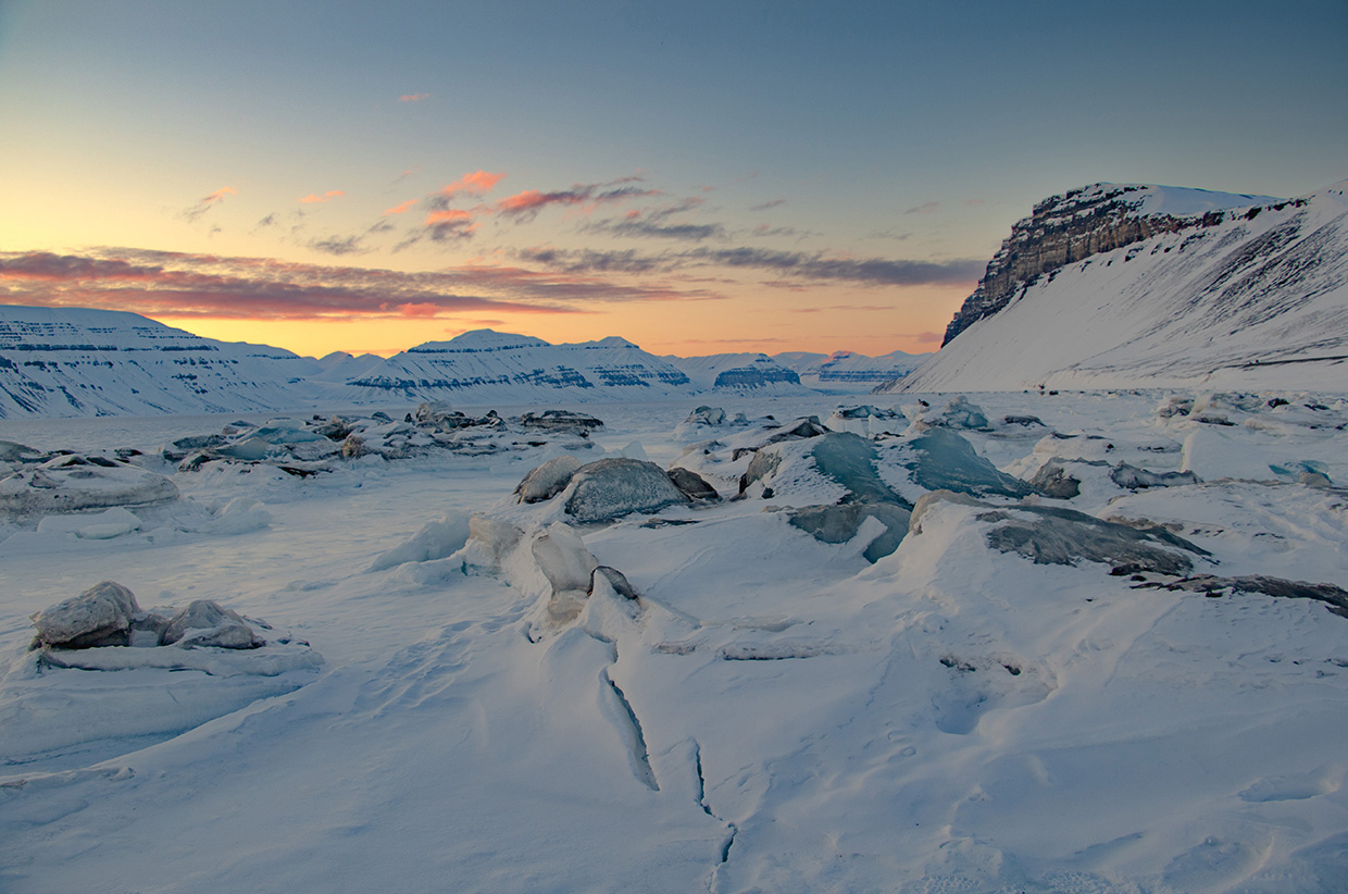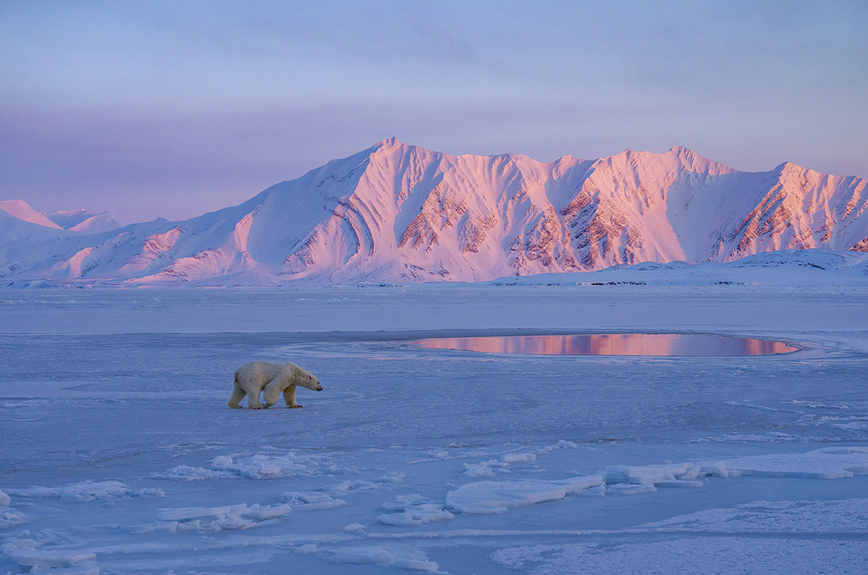 One day, after leaving the ship and exploring the thick sea ice on foot, we spot a bear shambling over the ice. But I quickly realise that it is not just one bear. It’s a mother with her cub close behind. The sun slowly tips behind the mountains, painting the landscape in pink and blue pastels. Soon the light fades.