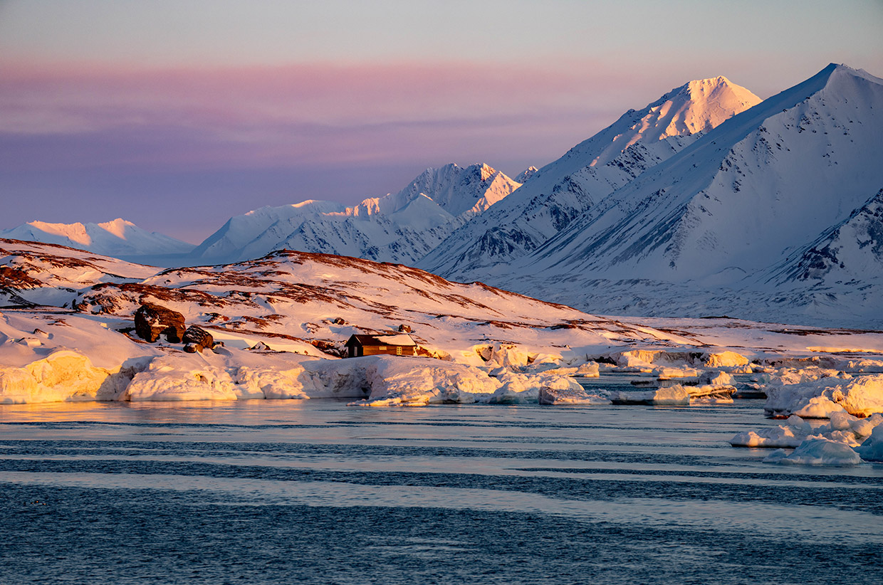 One day, after leaving the ship and exploring the thick sea ice on foot, we spot a bear shambling over the ice. But I quickly realise that it is not just one bear. It’s a mother with her cub close behind. The sun slowly tips behind the mountains, painting the landscape in pink and blue pastels. Soon the light fades.